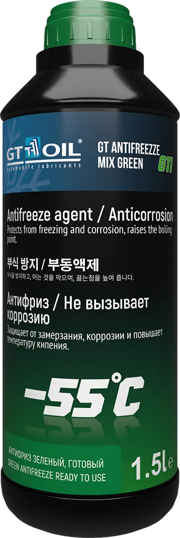 Готовый к использованию антифриз на основе моноэтиленгликоля, смешанный по технологии неорганических присадок и подготовленный путем смешивания с мягкой водой, предназначенный для использования при температуре -55 градусов. Данный продукт можно смешивать со всеми неорганическими охлаждающими жидкостями на основе моноэтиленгликоля. Он производится как неорганическая зеленая охлаждающая жидкость для всех систем охлаждения: легковых автомобилей, тяжелых грузовиков, строительной и сельскохозяйственной техники, садового оборудования, судов, стационарных двигателей и других промышленных применений. Соответствует спецификации G11.